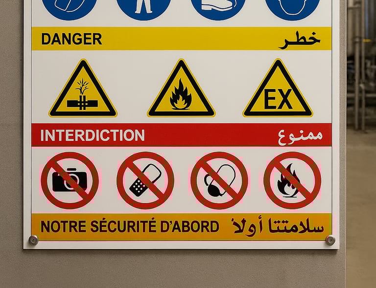 Nous concevons et réalisons des supports de signalisation de sécurité industrielle clairs, visibles et durables, adaptés à tous les environnements. De la création de consignes de sécurité aux plans d’évacuation et de circulation, en passant par les enseignes et totems, lumineux ou non lumineux, SignAfric transforme vos contraintes réglementaires en outils de prévention efficaces et en éléments de valorisation de votre site.